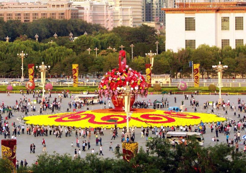 自1984年起,每年国庆,均以花坛装扮天安门广场。每年的花坛都以当年发展的新成果、新亮点作为设计主线,透过一个个花篮,能一窥国家和人民的大事喜事。岁月流转40载,曾经元素较为单一的平面花坛,如今已演变成色彩更丰富、造型更精雅、内涵更饱满的立体花坛。这把历史标尺,镌刻着时代发展的印记。